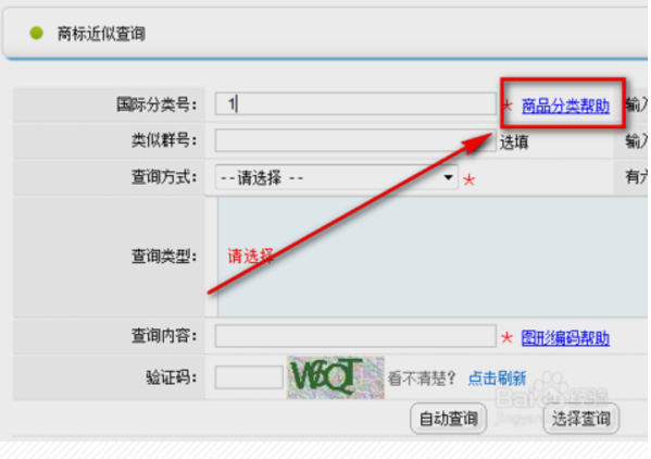 4.商标查询界面第一个框要填写国际分类号,应输入阿拉伯数字,从1开始。如果不知道分类号是什么,可以点击查看【商品分类帮助】。下面的【类似群号】可以留空,不填写。如图: