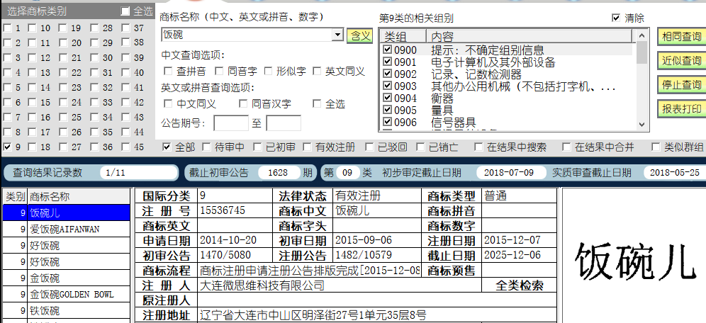 商标查询结果:饭碗在第35类存在近似商标爱饭碗,不建议注册。